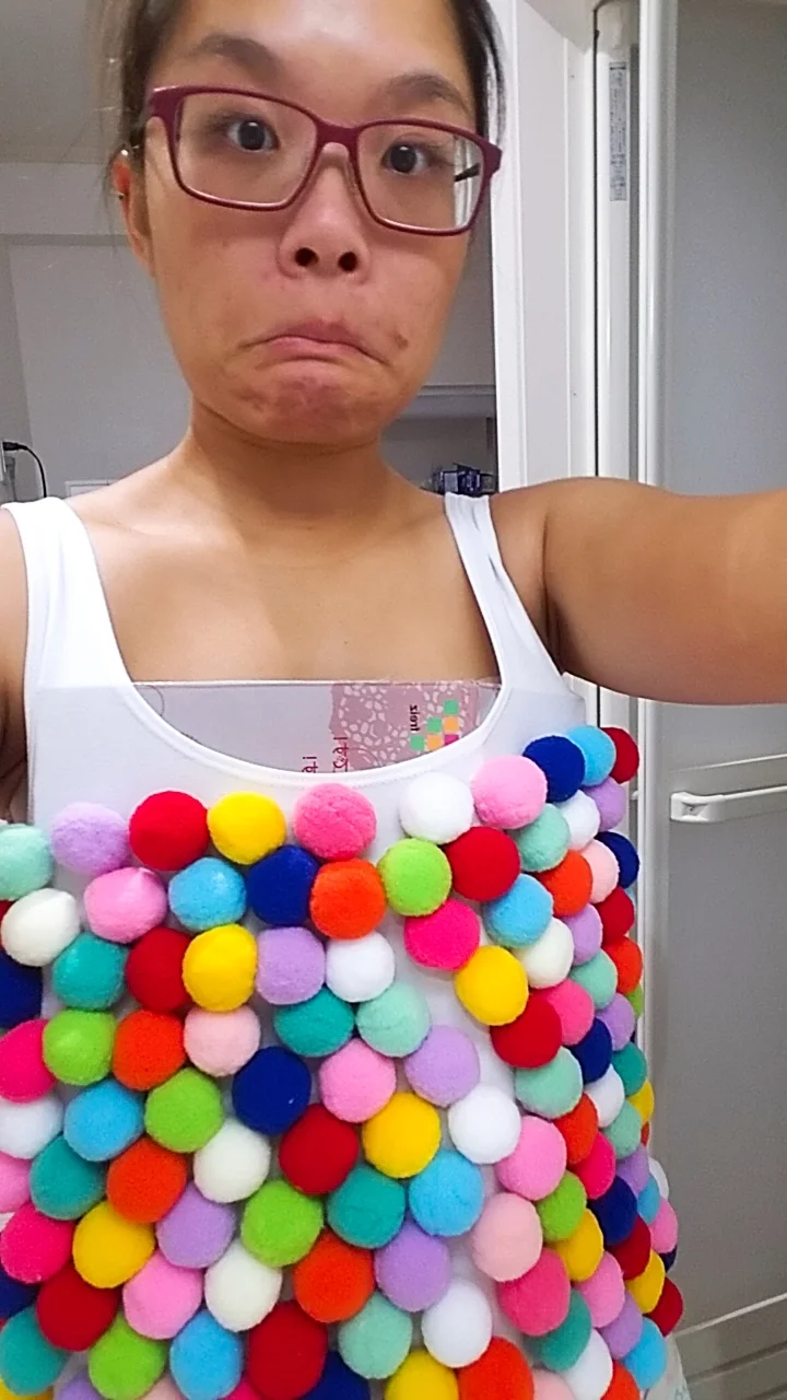 I had finished this costume with three different DIY sessions, one for the skirt which didn't take me very long (30 mins tops) and two for the top. The finishing touches I added for this costume actually required me to wear the top while I glued mini pom poms to myself...don't worry, I put some cardboard underneath so I wouldn't burn myself lol 😂.